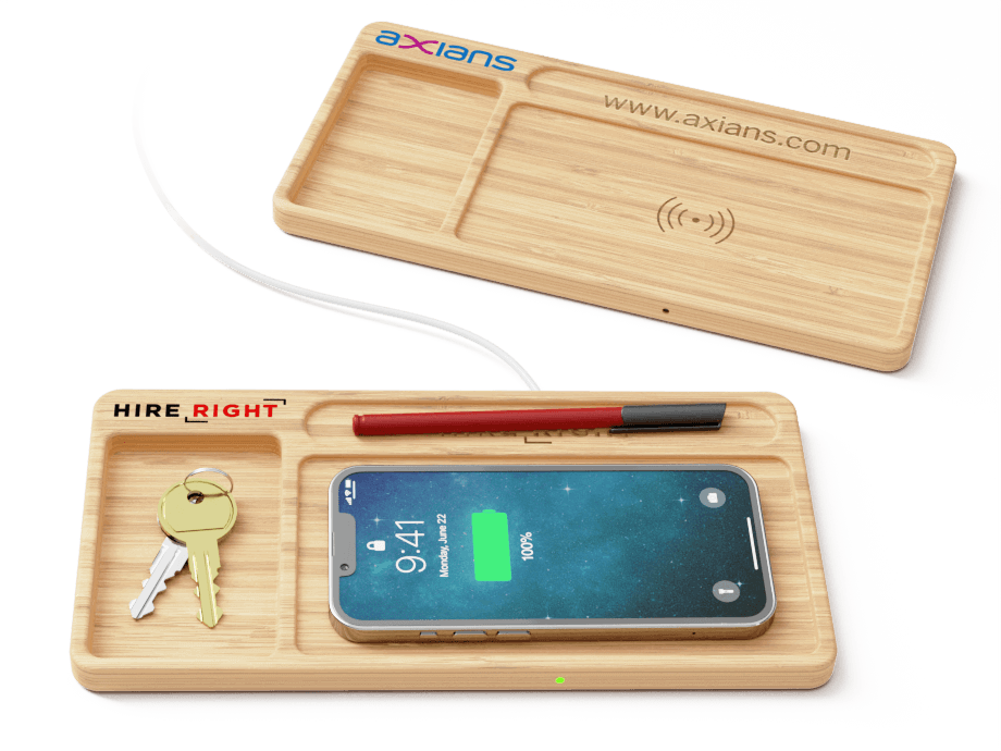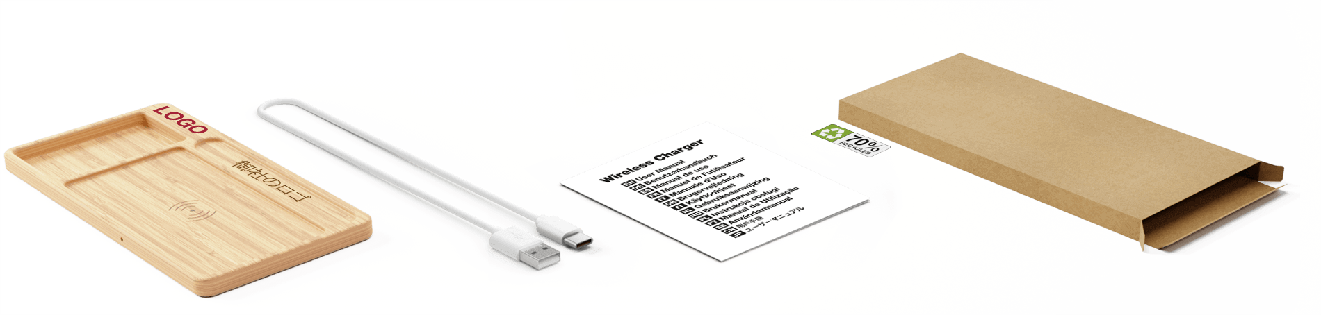『エコ・デスク』ワイヤレス充電器は、デスクの整理整頓に役立つ、とても便利なアクセサリです。ワイヤレス充電に対応するスマートフォンであれば、主要ブランドの製品を含み、ほぼ全てに互換性があります。印刷エリアには、スクリーン印刷またはレーザー彫刻によるロゴなどの名入れをすることができ、毎日の生活の中で活用されることが期待でき、ロゴの露出効果が最大限まで高められる優れたノベルティです。