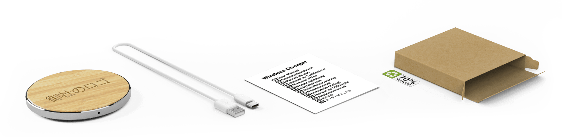 『リング』ワイヤレス充電器は、ロゴを美しくディテールまで名入れすることのできる、木目が印象的なボディが自慢のモデルです。FSC認定の竹材製の『リング』は、長期間に亘ってご愛用頂くことのできる販促用ノベルティとしては、最高の製品です。製品の価格情報やサンプルのご要望や、納期の情報はいつでも気軽にお問合わせください。