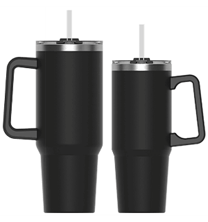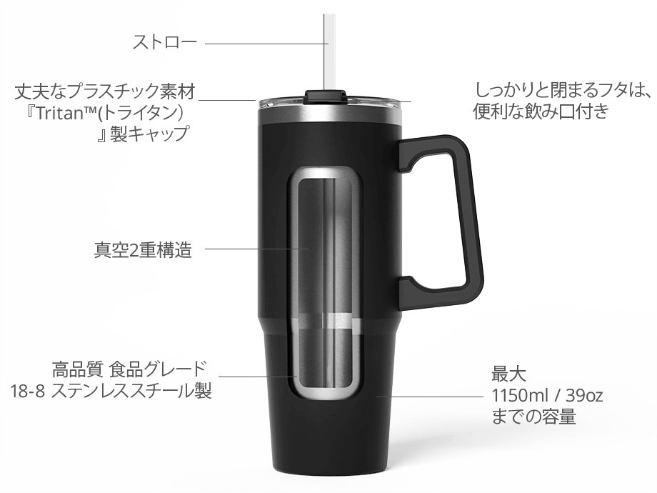 携帯用カップ『ジャンボ』の特長は、二重壁断熱構造、持ちやすい取っ手、飲み口付きの安心設計なフタ、そして耐久性の高さで知られるTritan™製のストロー付きと、人気の条件がそろったタンブラーモデルです。また、ロゴやスローガンなどを精細にプリントするための印刷エリアも、もちろん備わっています。お見積りやサンプルのご要望、配送に関するお問い合わせなど、いつでもお気軽にご連絡ください。