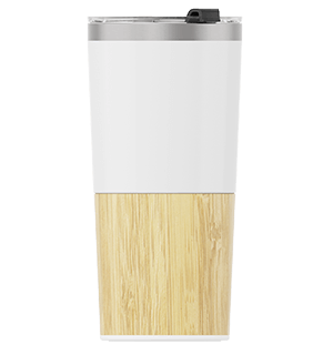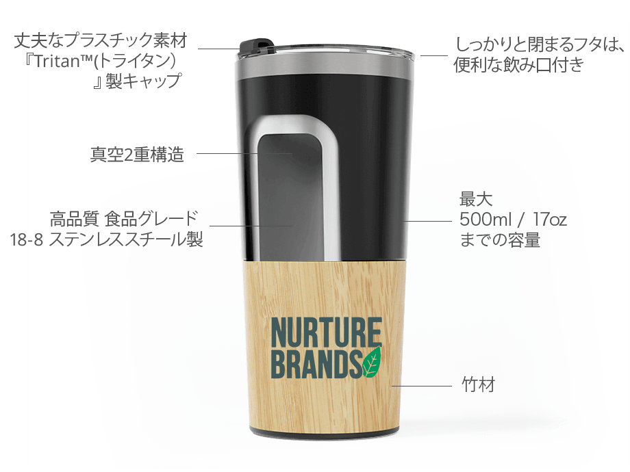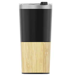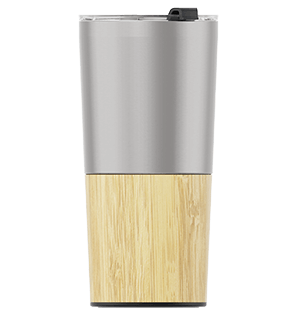 『メトロ・バンブー』は、美しいデザインの携帯カップ製品で、飲み物の保温・保冷に効果を発揮する二重壁構造による断熱性が自慢のモデルです。姉妹モデルのと同様にTritan™樹脂製で飲みやすい飲み口付きのフタや、カップ本体の下部にかけての美しい竹材の外装、そしてロゴやスローガンなどを名入れできる印刷エリアを備える優れた製品です。