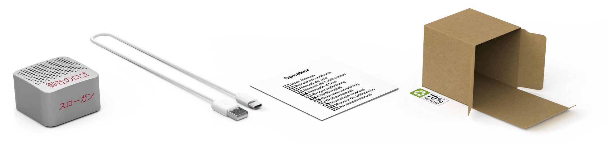 Bluetooth® ネームとは、オーディオ製品をペアリングするスマートフォンやタブレットなどに表示される、オーディオ製品に設定された名前です。このオーディオ製品名をカスタマイズして販促や記念品などの目的に適した名前を付けておくことで、更に名前がユーザーの目に触れる機会が増えて記憶に残りやすくなる効果が期待できます。このサービスのご注文がない場合のオーディオ製品はデフォルト設定の名前で「Promo Audio」と表示されます。アクセサリ