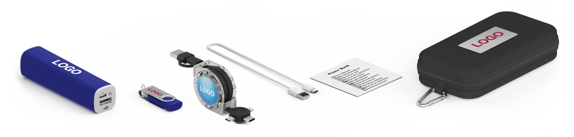 3つの商品を組み合わせた便利なトラベルギフトセット: Twister USBメモリ, Core モバイルバッテリー, Motion USBケーブル. これらの選び抜かれた弊社の商品に御社のロゴ、URL、またはスローガンなどを印刷することができます。ギフトケースの表面にはレーザー彫刻または4色以内であればスクリーン印刷を施し、ロゴを印刷することができます。 製品の本体カラーの組み合わせは、ご自由にお選びください。