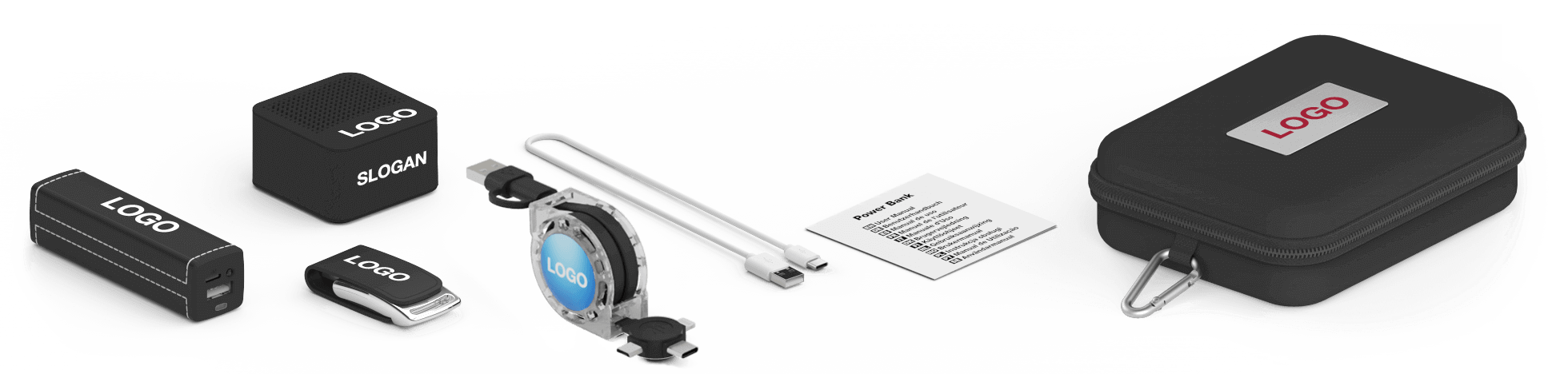 4つの商品を組み合わせた便利なトラベルギフトセット: Executive USBメモリ, Lux モバイルバッテリー, Motion USBケーブル, Ray Bluetooth® スピーカー. これらの選び抜かれた弊社の商品に御社のロゴ、URL、またはスローガンなどを印刷することができます。ギフトケースの表面にはレーザー彫刻または4色以内であればスクリーン印刷を施し、ロゴを印刷することができます。 製品の本体カラーの組み合わせは、ご自由にお選びください。