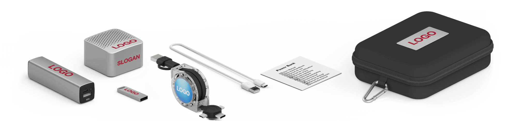 4つの商品を組み合わせた便利なトラベルギフトセット: Focus USBメモリ, Element モバイルバッテリー, Motion USBケーブル, Tab Bluetooth® スピーカー. これらの選び抜かれた弊社の商品に御社のロゴ、URL、またはスローガンなどを印刷することができます。ギフトケースの表面にはレーザー彫刻または4色以内であればスクリーン印刷を施し、ロゴを印刷することができます。 製品の本体カラーの組み合わせは、ご自由にお選びください。