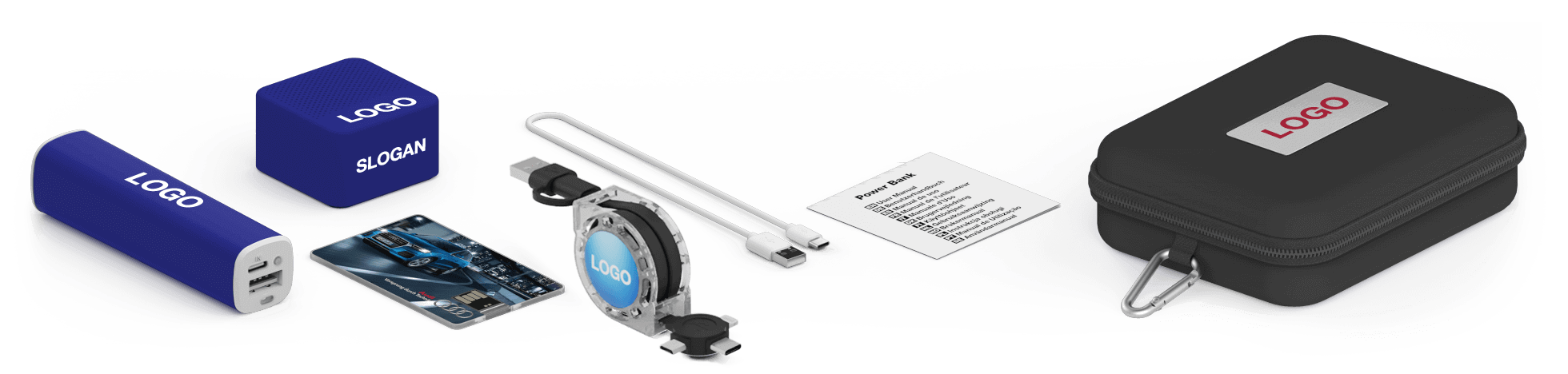4つの商品を組み合わせた便利なトラベルギフトセット: Wafer USBカード, Core モバイルバッテリー, Motion USBケーブル, Ray Bluetooth® スピーカー. これらの選び抜かれた弊社の商品に御社のロゴ、URL、またはスローガンなどを印刷することができます。ギフトケースの表面にはレーザー彫刻または4色以内であればスクリーン印刷を施し、ロゴを印刷することができます。 製品の本体カラーの組み合わせは、ご自由にお選びください。