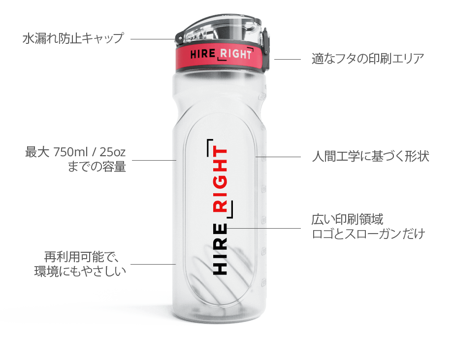 シェイカーボトルは、ロゴまたはスローガンを表示し、ブランド認知度を高めるために、2つの広々としたブランディングエリアで完全にカスタマイズ可能です。ボトルの胴体部分には縦に、蓋の付け根部分には横にロゴを入れることができます。