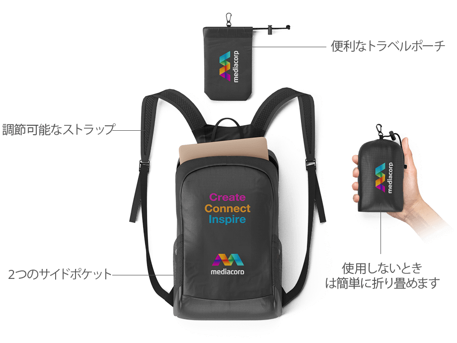 丈夫なポリエステルで作られたこの軽量リュックサックは、便利な折りたたみ式デザインで、使用しないときは専用のスタッフサックに簡単に収納できます。通勤や週末のハイキングなど、お客様や従業員の旅のお供に最適です。