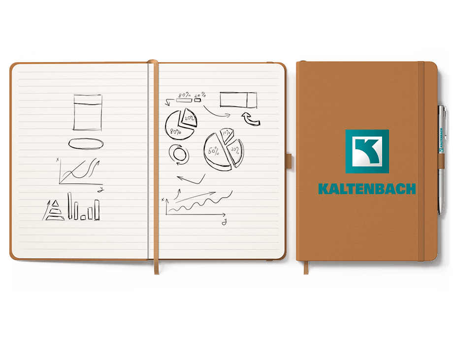 と同様に、人工レザーと厚紙の表紙を使用し、お客様のロゴを美しく際立たせるデザインとなっています。カバーの中には、白い罫線入り用紙が160ページ収められています。サイズ