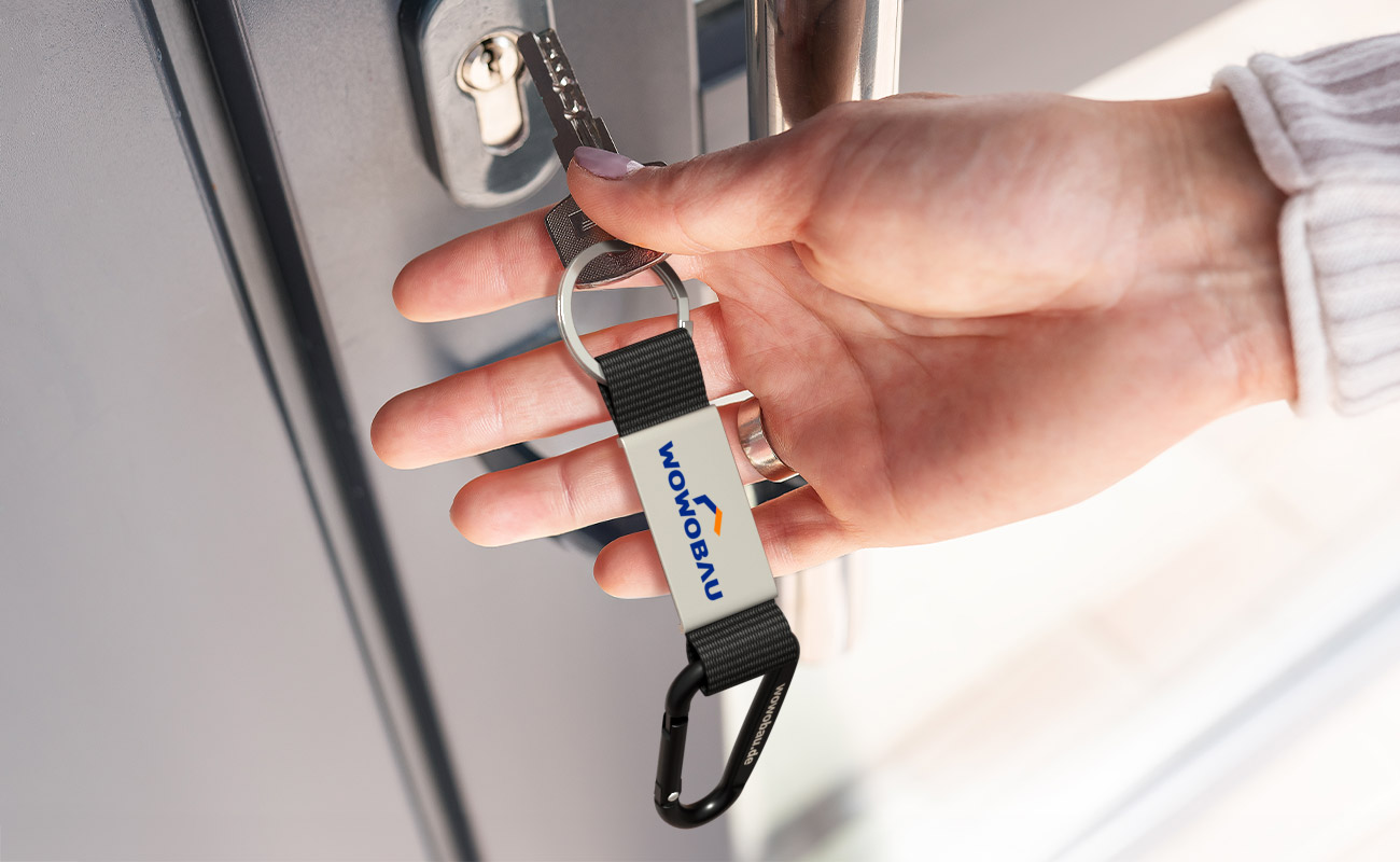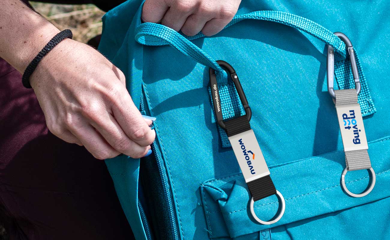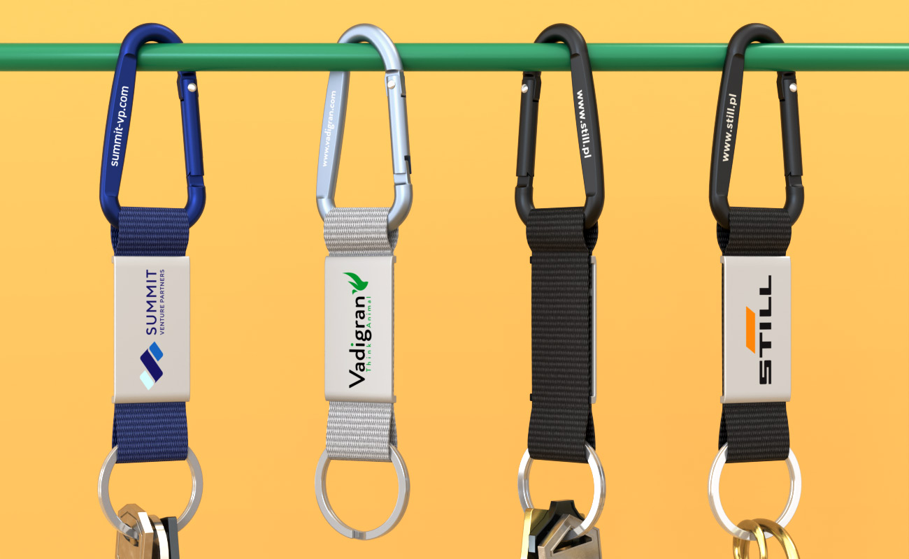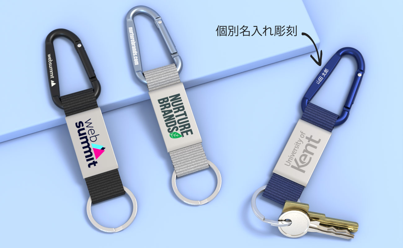 当社のキーホルダー『アンカー』は、スタイリッシュな販促ノベルティとして、日常的に使用することによるブランド認知度の向上を想定してデザインされた製品です。片方の端にはカラビナクリップが装備され、ロゴなどを印刷するための印刷エリアが備わっています。反対側の端には、鍵を取り付けられる、スプリットリングループが付いています。ストラップを巻き付けたメタルパーツにもロゴやスローガンなどを入れられるデザインになっています。