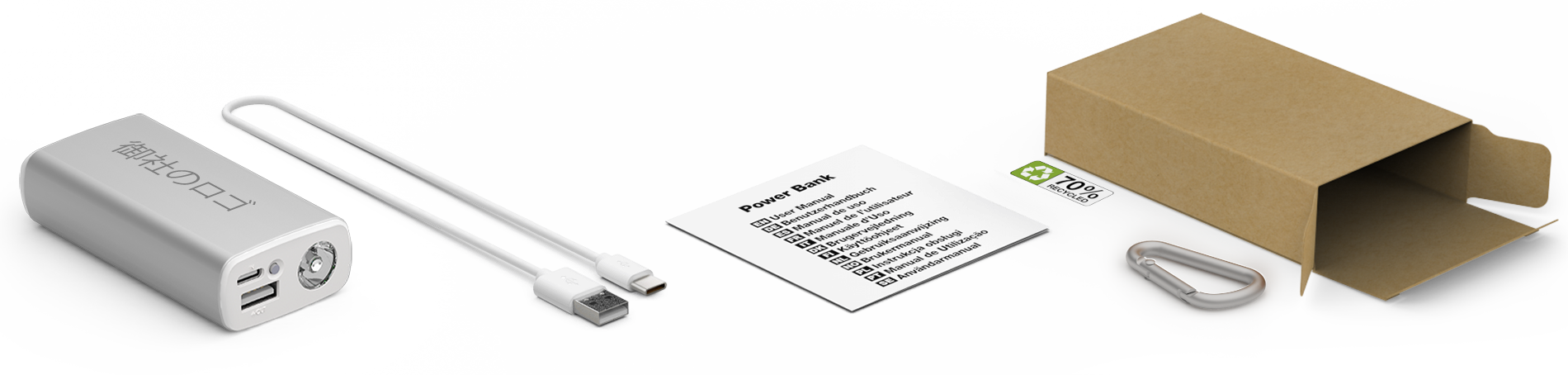 大きな印刷エリアをもちながらも、手のひらにすっぽり収まるサイズの『アンコール』はプロモーションに最適なモバイルバッテリー。カラビナを装着すれば携帯にも便利です。最大容量6,700mAhまでご用意がございます。