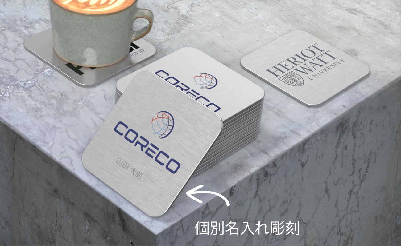 当社の人気ノベルティ『ディスク』は、長くご愛用いただくことのできる名入れコースター製品です。人の目をひきつける艶消しのアルミニウム合金製の外観が特徴的で、ロゴやスローガンなどを名入れすることができる印刷エリアが備わっています。製品の底面は、滑り止めになるコルク素材でできています。製品の価格、名入れ方法、納期などの情報は、「お見積り依頼」のリンクをクリックしてお問い合わせください。