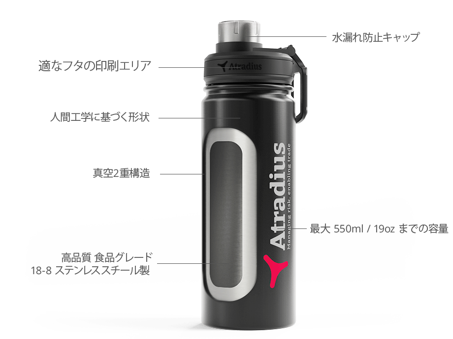 当社では、製品のボディ全体をぐるりとアートワークで覆う360°全面の名入れが可能です。これら日常的に使用可能な製品に、非常に鮮明で華やかな仕上がりのロゴ入れが可能です。