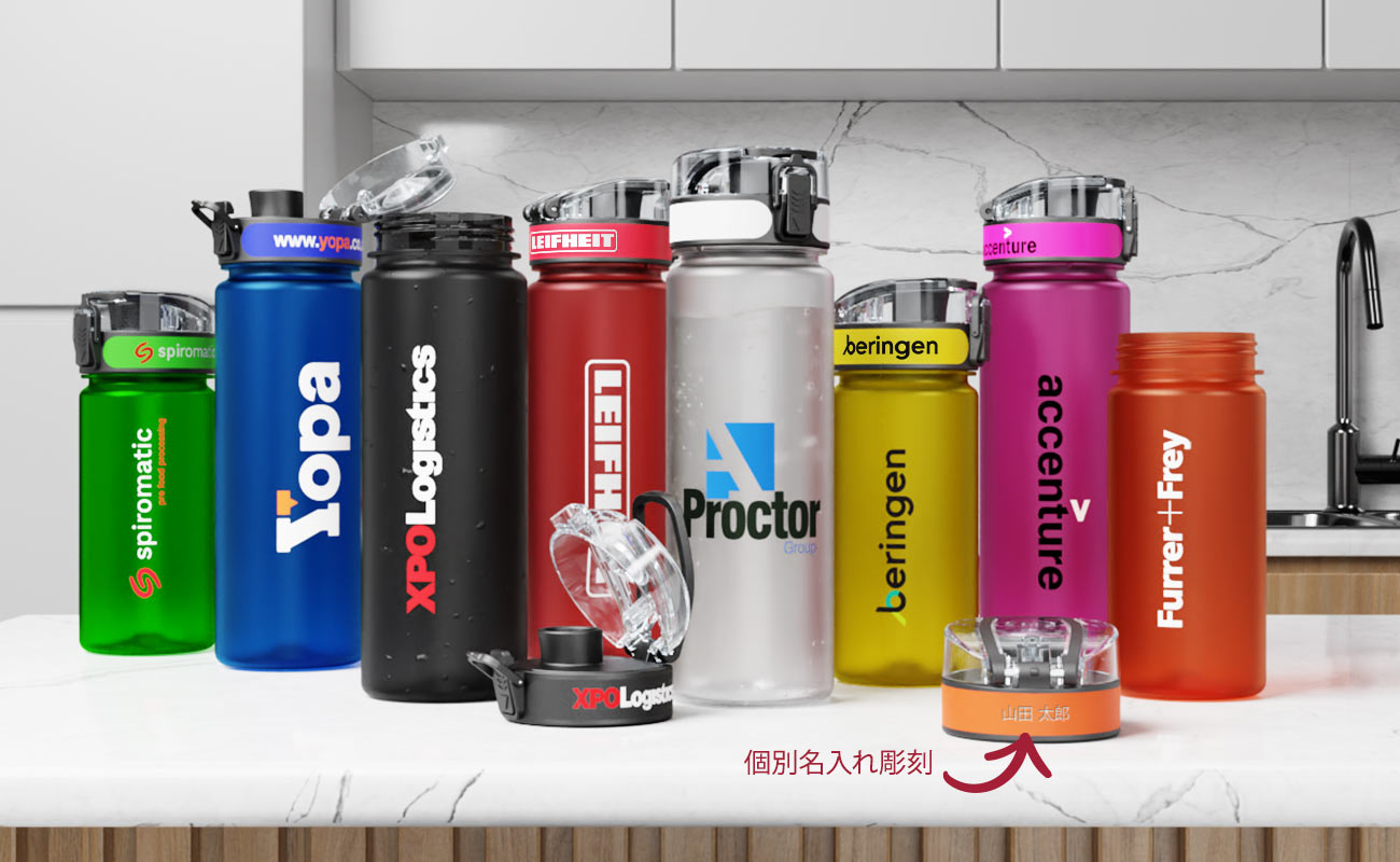 当社では、製品のボディ全体をぐるりとアートワークで覆う360°全面の名入れが可能です。これら日常的に使用可能な製品に、非常に鮮明で華やかな仕上がりのロゴ入れが可能です。