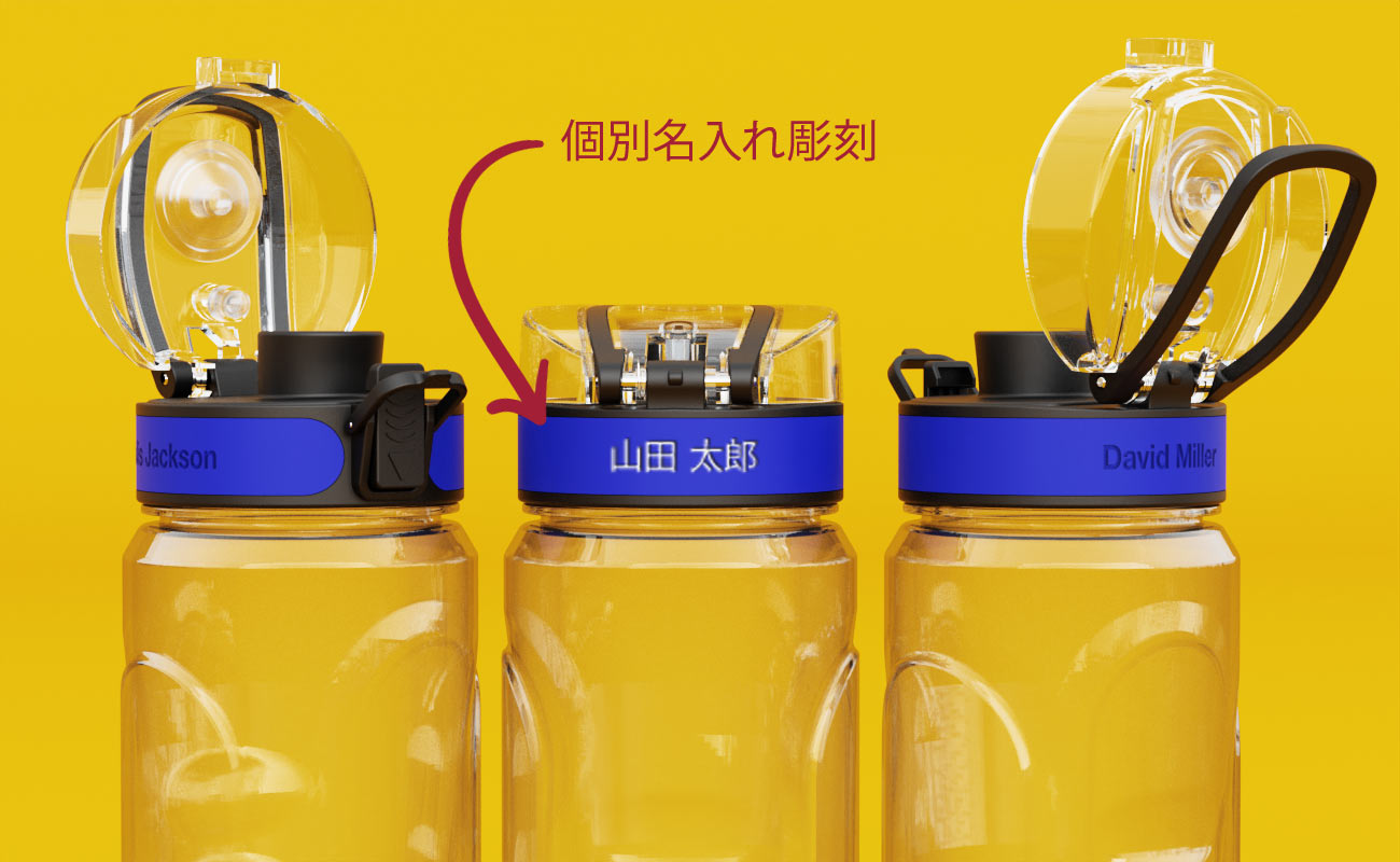 レーザー彫刻は、完全に消えることのないように名前の刻印を行うものです。個別の名前の刻印は、学校やクラブ活動などのトレーニングや大会などの最中に、自分のウォーターボトルやトラベルカップを見分けられるようにしておく最良の方法です。ロゴやスローガンなどと一緒に、個別のお名前をドリンクウェアに刻印するサービスです。