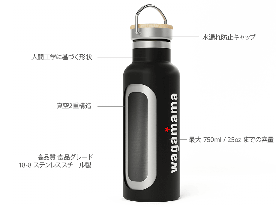 当社の二重壁構造金属製ウォーターボトル『トラベラー』は、真空断熱構造の技術を採用し、お飲み物の温度を長く維持できるようにデザインされた製品です。ウォーターボトル本体の広く確保した印刷エリアには、ロゴをスクリーン印刷またはレーザー彫刻で名入れすることができます。また、バンブー(竹材)製のキャップ部分にも、ロゴなどをスクリーン印刷で名入れすることが可能です。また、外出時の持ち運びに便利なキャリーループが装備されています。