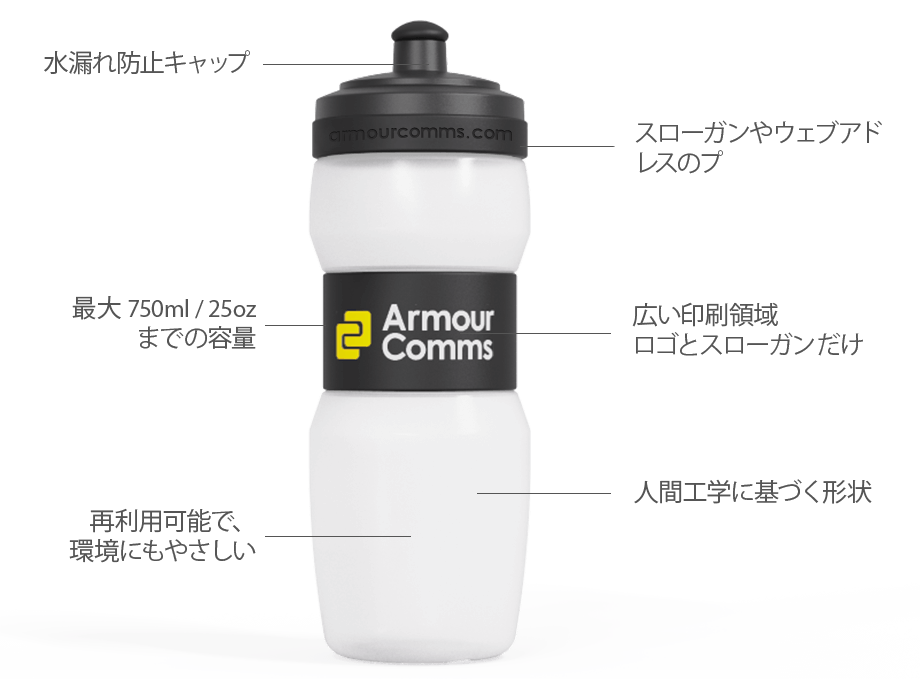 『フィット』ウォーターボトルは、今後のカンファレンスやイベントでの必須アイテムです。グリップ部分には、ロゴの名入れができ、またキャップの側面にはウェブアドレスやスローガンなどを、レーザー彫刻による名入れが可能です。『フィットは、』500ml と750mlのサイズ2種類からお選び下さい。