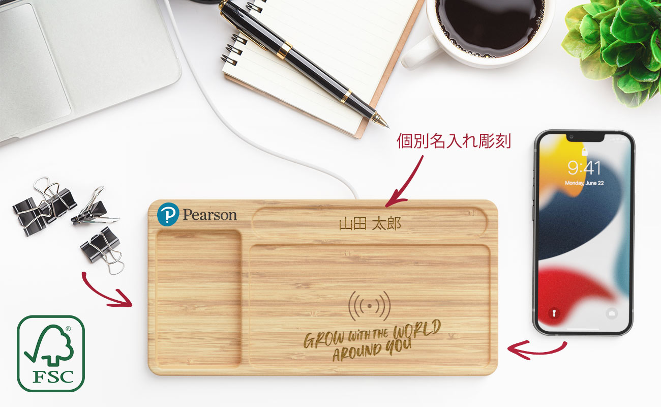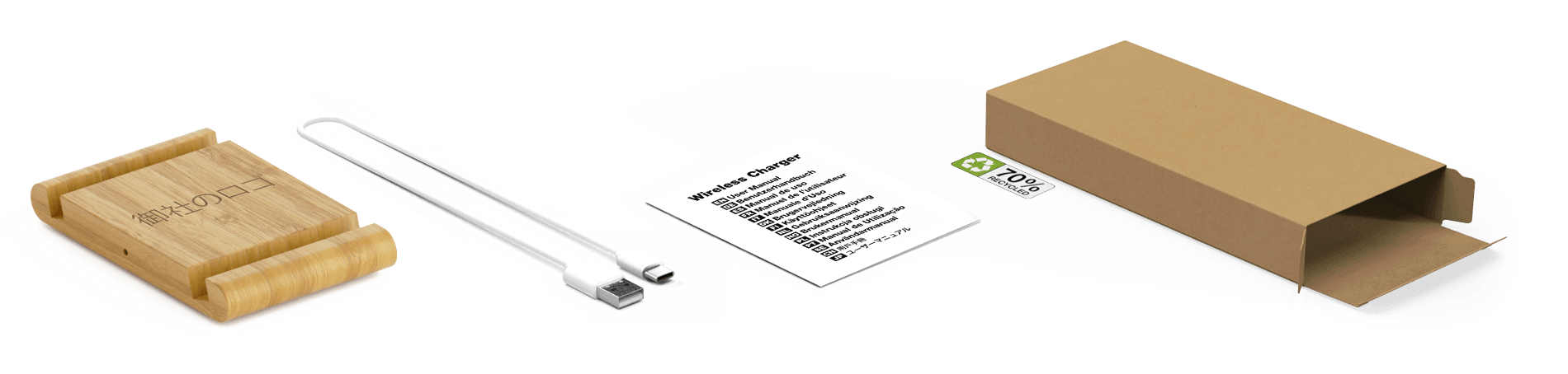 『テラ』ワイヤレス充電器は、美しいバンブー素材で御社のロゴを名入れできます。滑らかなラインとスタイリッシュな曲線が自慢の『テラ』は、スマホスタンドとしても使えるので、クライアントやスタッフ、イベント参加者に人気アイテムです。最新価格、納期、名入れ情報については、今すぐお問い合わせください。